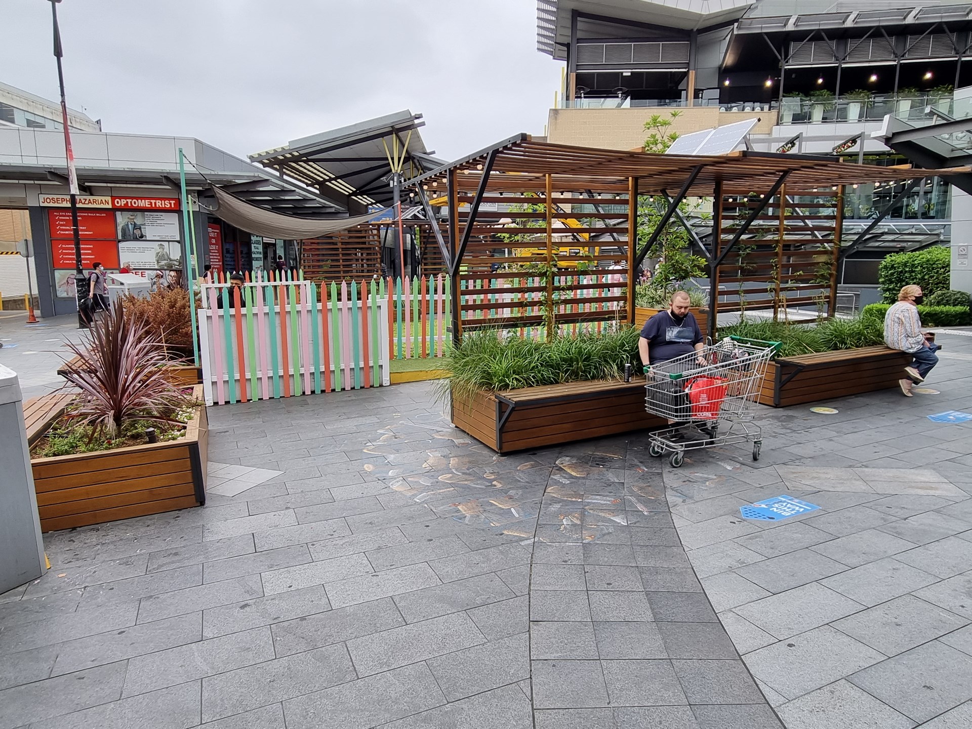 The Urban Parklet was updated in 2021 with the addition of a kids play area, picket fencing and sail shade attached to the Large Planters to provide further cooling. This zone was used by council for library reading and other children activations.