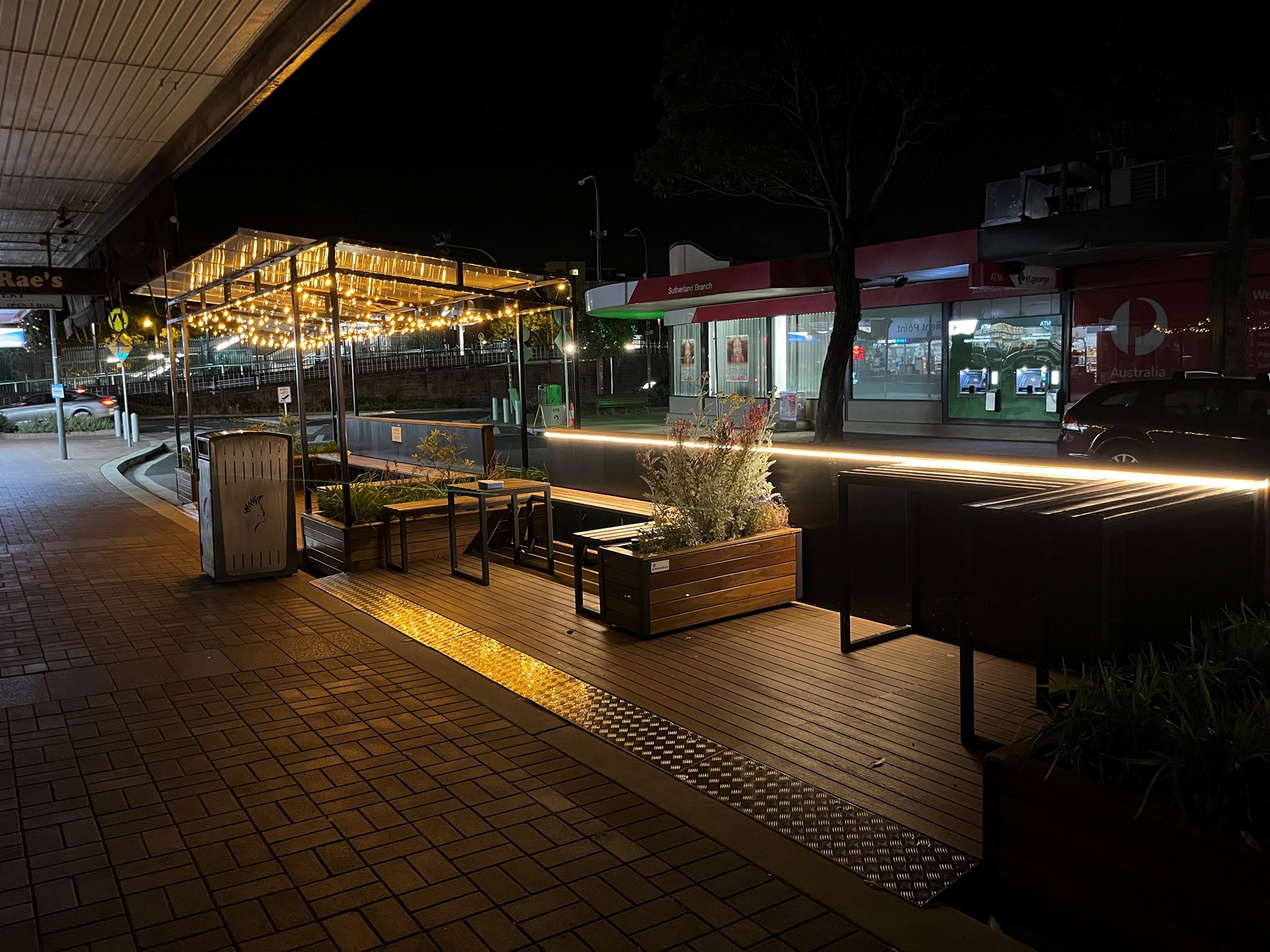 Flora street is a main thoroughfare for the train station, cafes, bus connnections and CBD of Sutherland. As part of the NSW Streets as Shared Spaces grant Sutherland tendered for 3 x 20m road parklets to create a vibrant and active space by relocating and increasing outdoor dining and parklets along Flora Street. We proposed a design incorporating Future Village modular parklets and Transportable Pergola parklets.