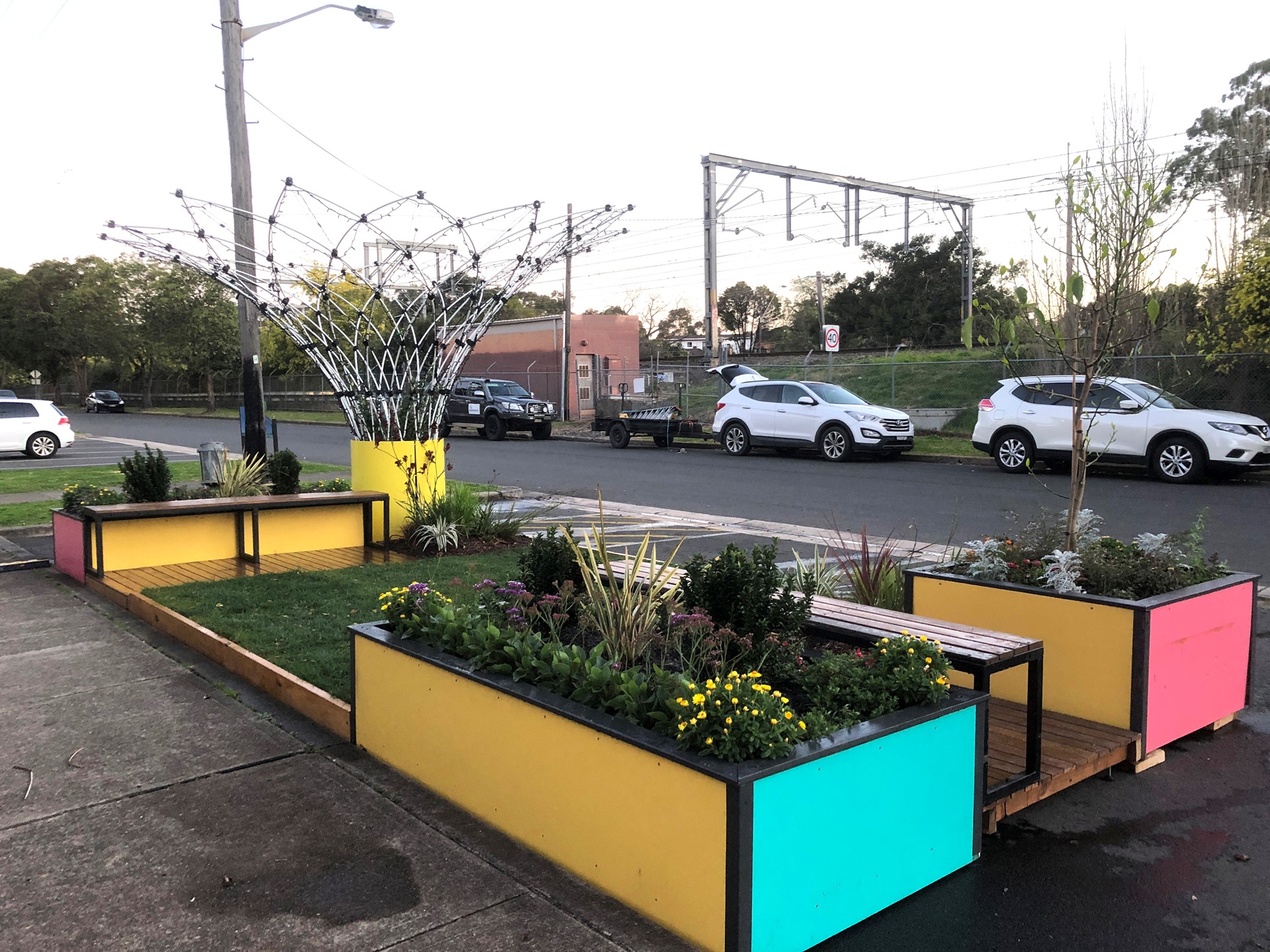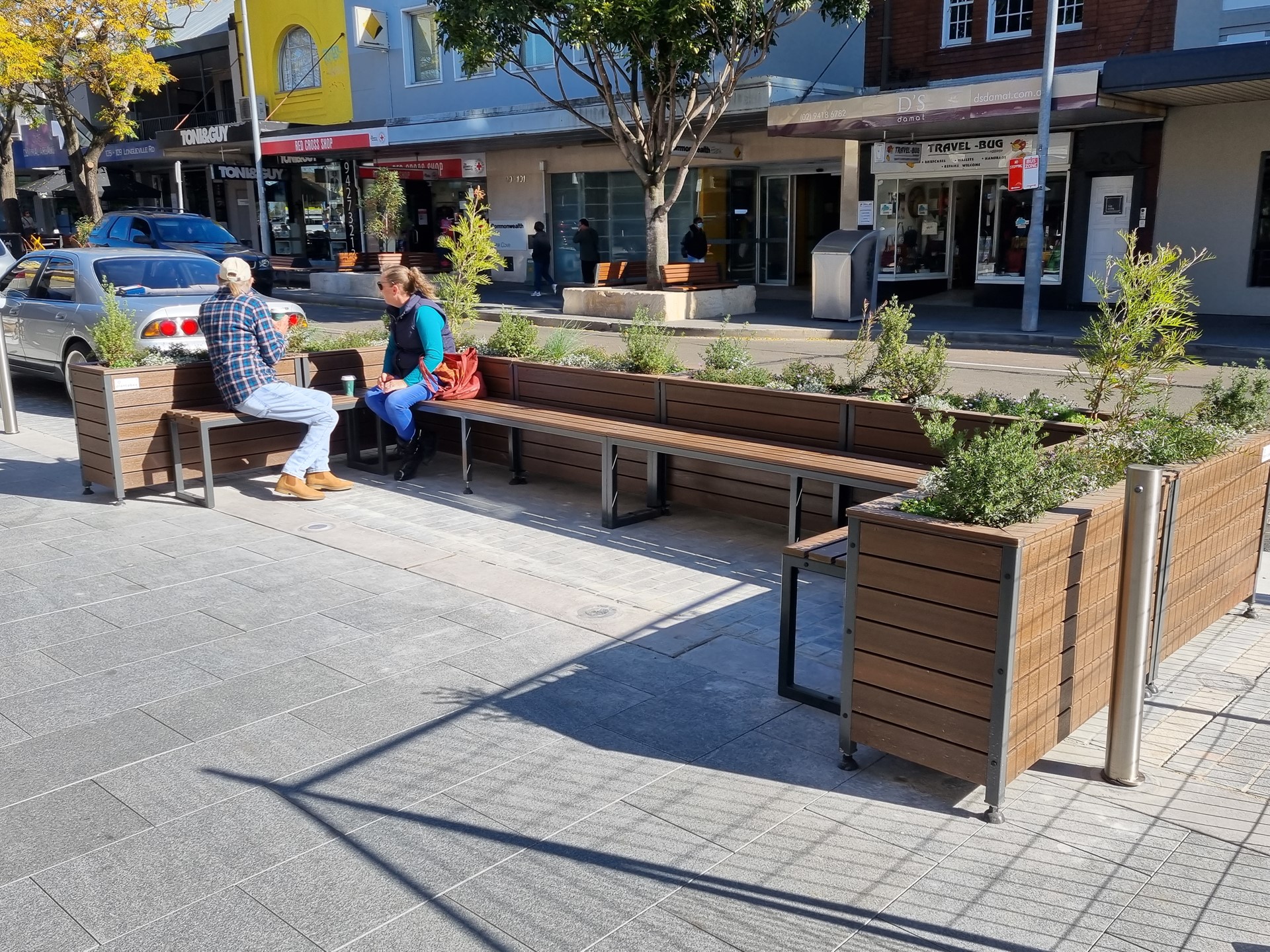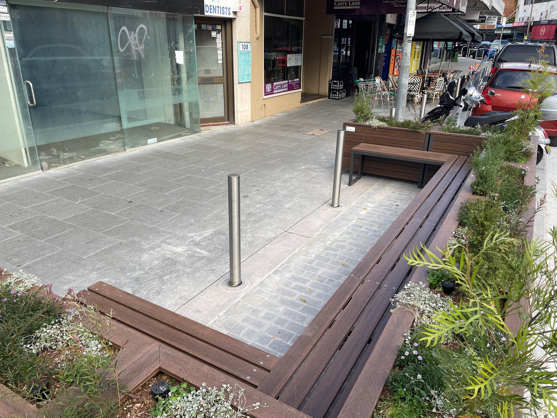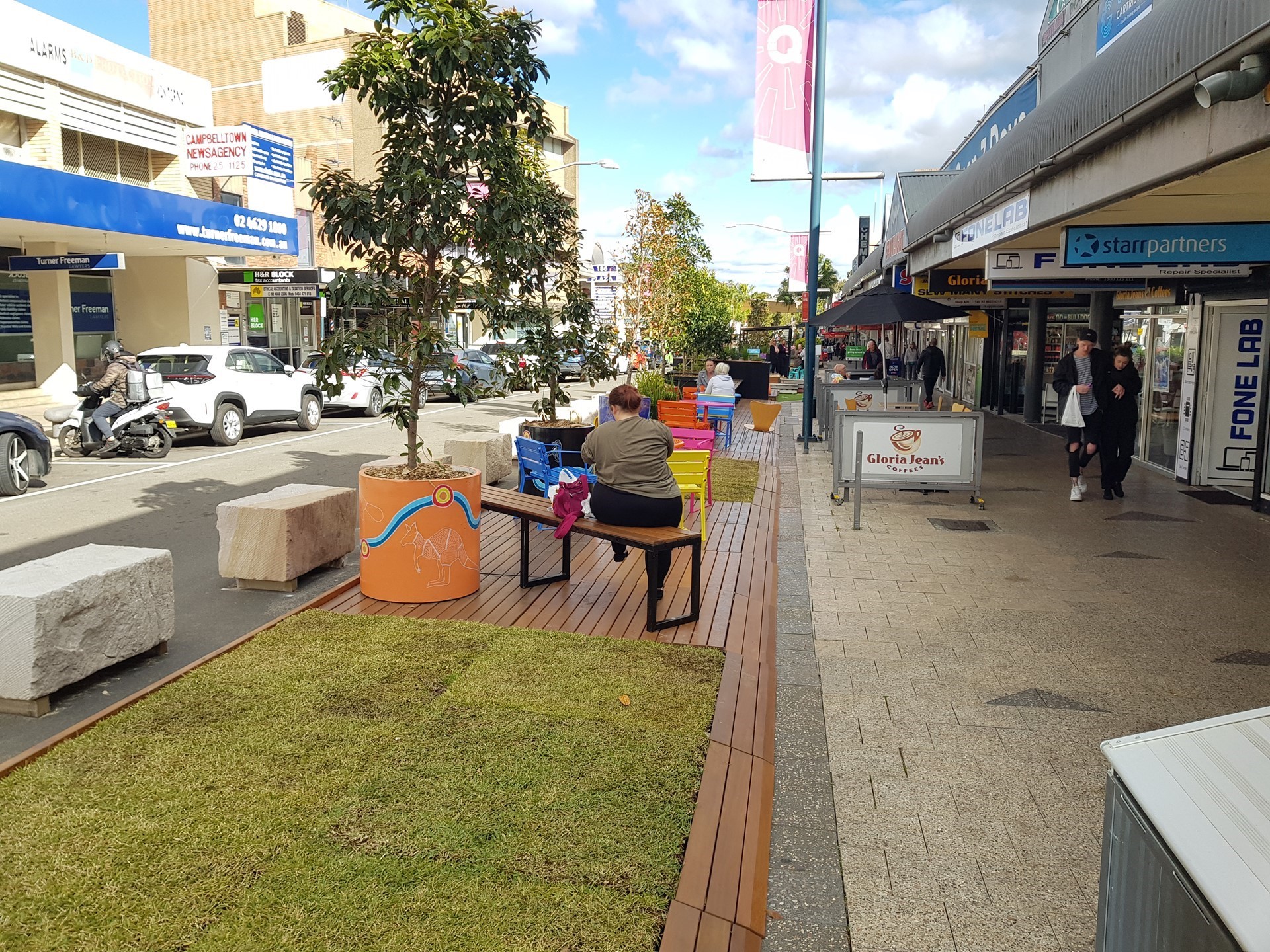 Campbelltown council was looking at ways to provide greenery and more seating to this street. We worked with their team to design the space and build gardens directly onto the road using our process in Wollongong.