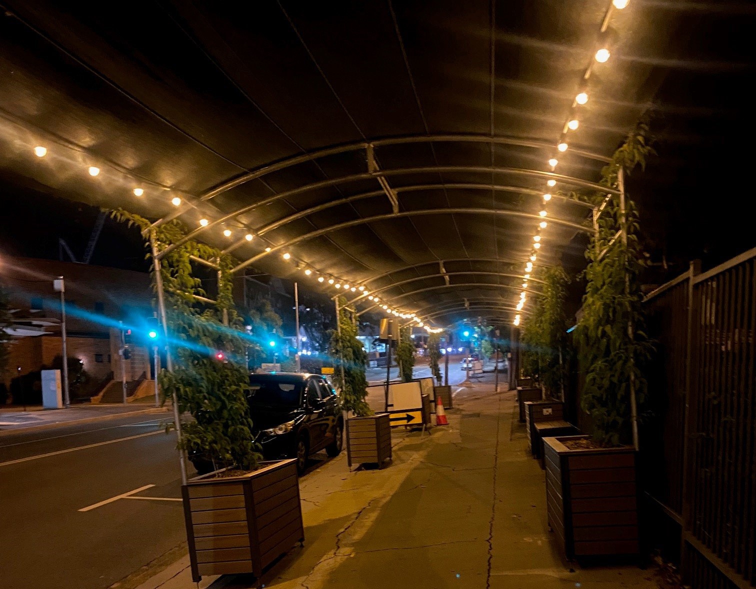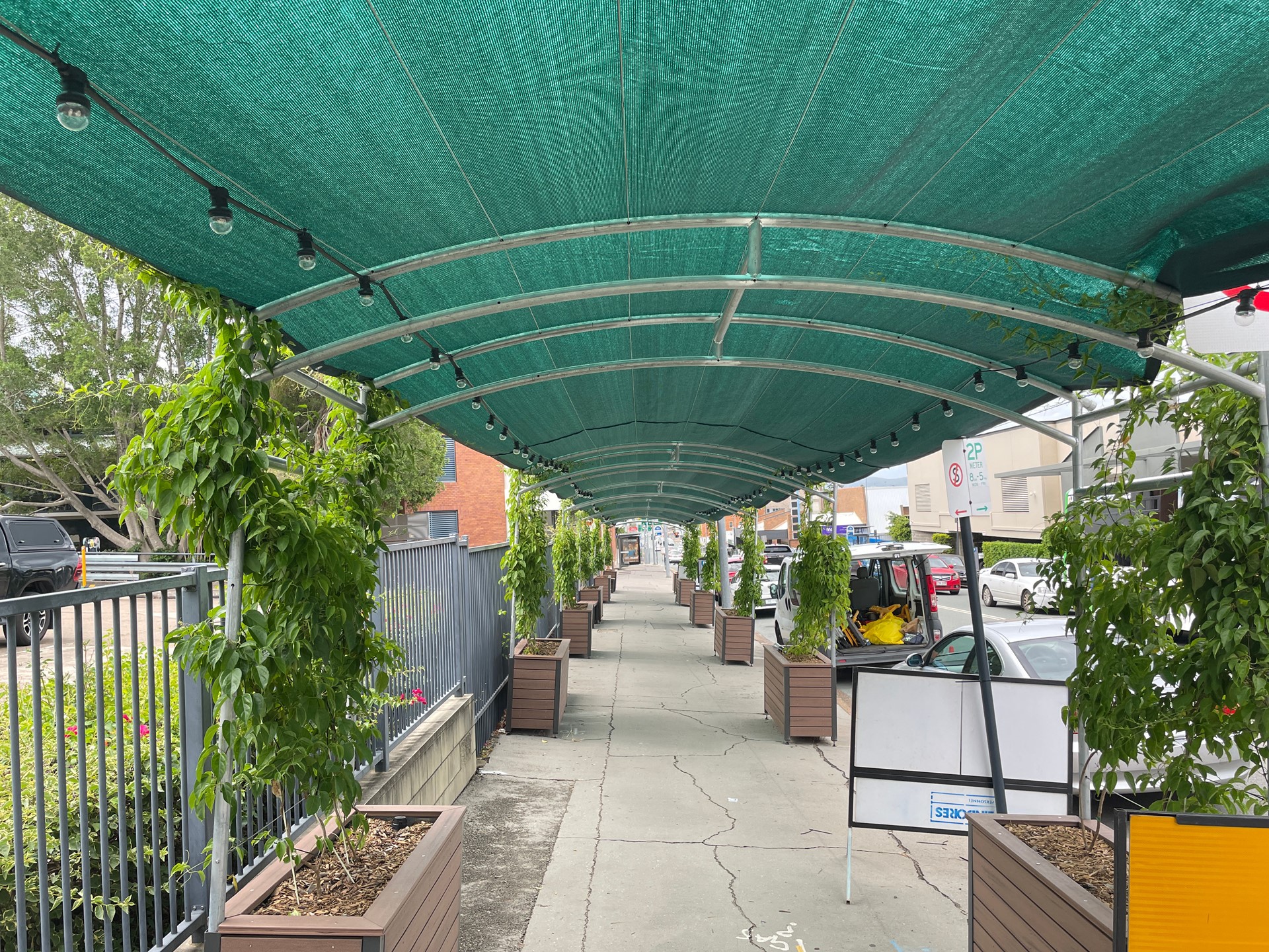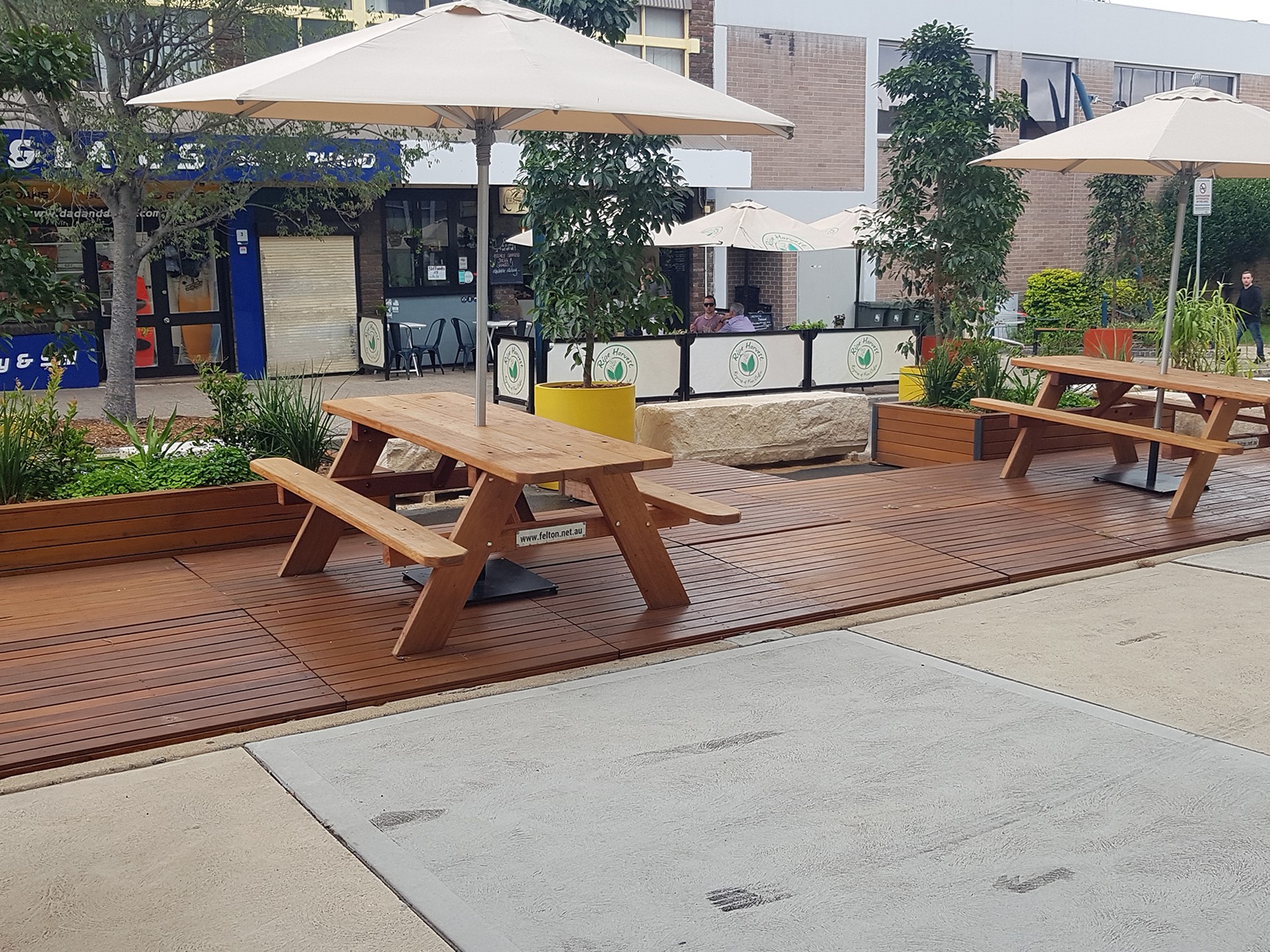 In conjunction with Sutherland Shire Council we designed outdoor dining on both sides of the road. To the north we used two Pergola parklets intermixed with decking, seating, tables and planters. To the south were three Plantabox Pergolas with open deck areas. The Pergolas and decking areas lit with a mixture of fairy lights and LED strip lighting. All vertical surfaces skinned with local indigenous artwork.