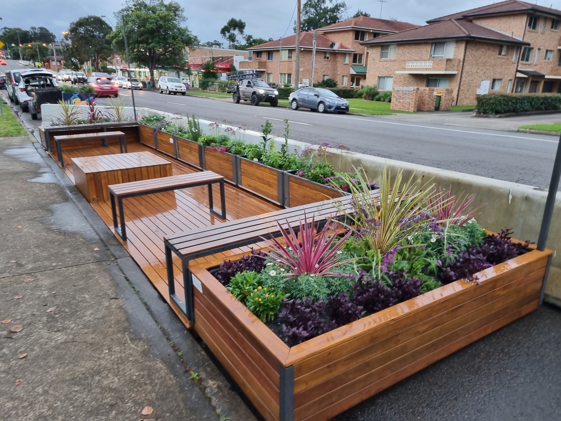 The town of Cardiff, part of Lake Macquarie City Council planned installation of four parklets as well as street and tree planters. We used four Pergola parklets and combined with our street planters.
