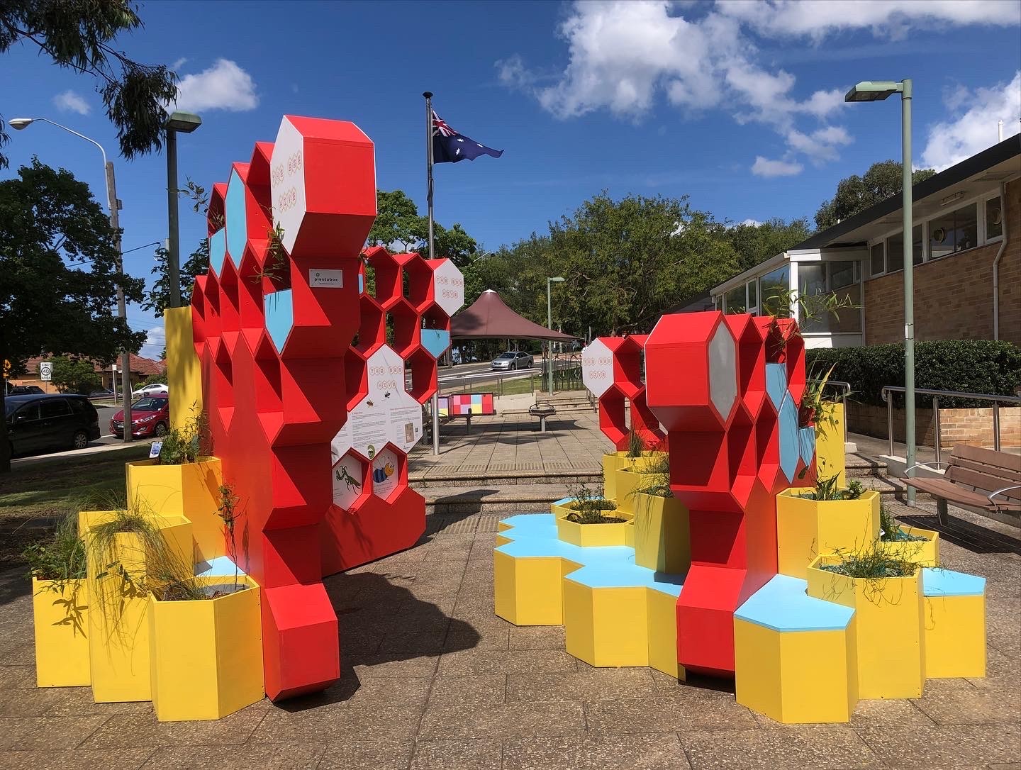 Canterbury Bankstown developed community micro-rooms. We won the tender to develop an educational room informing the community about beneficial insects and how to attract them to your garden. Our design was based on hexagonal walls and planters enabling indigenous plants, native stingless bee hive and information to be portrayed in a fun and engaging manner.
