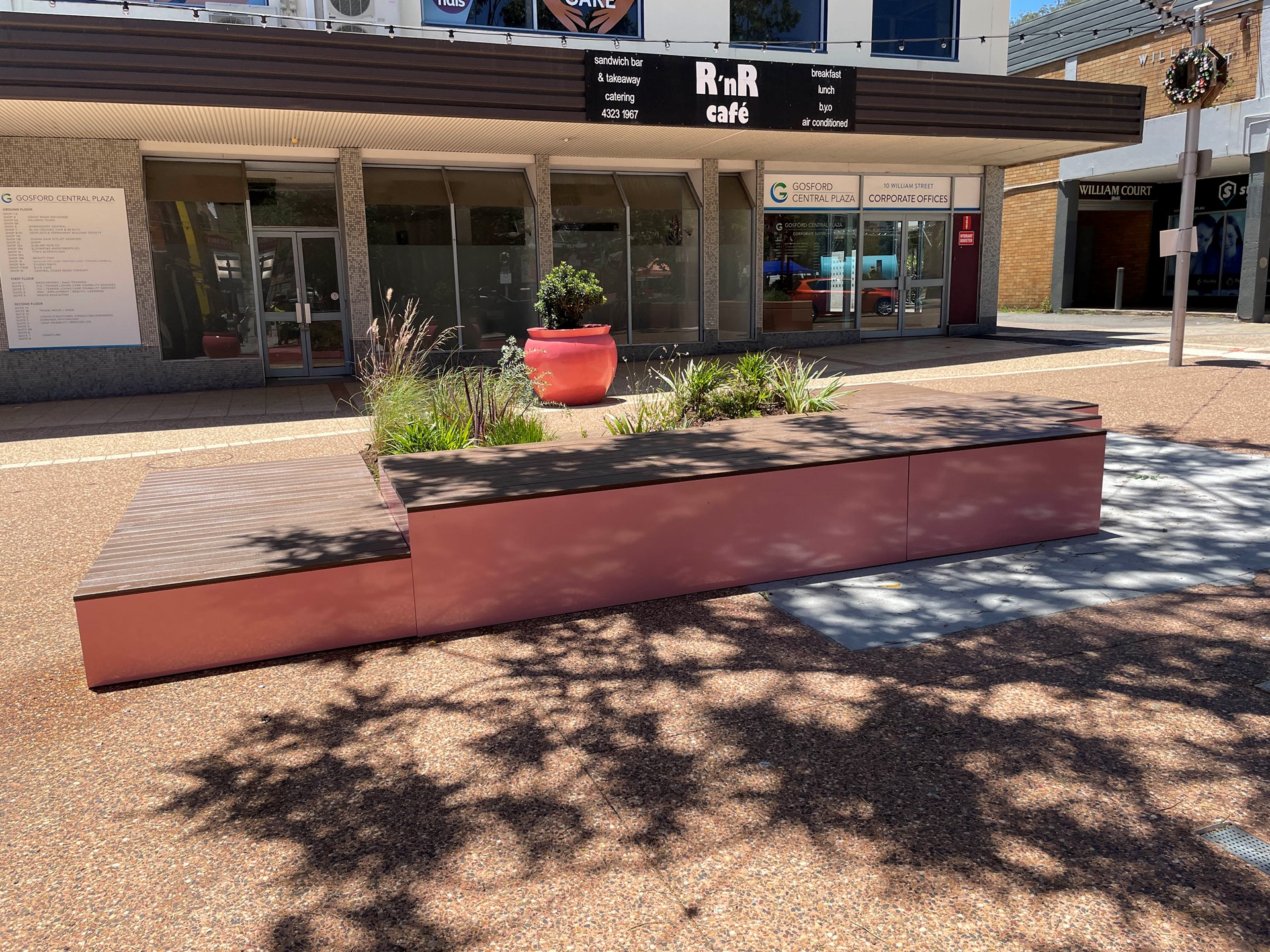 Central Coast Council, as part of the Safer Cities NSW Govt funding, wanted to revitalise William Street Plaza to provide greater site lines through the mall as well as make the space more attractive for the local community. We designed two floating gardens comprised of tiered seating and garden areas as well as retrofitted water saving into current planters.