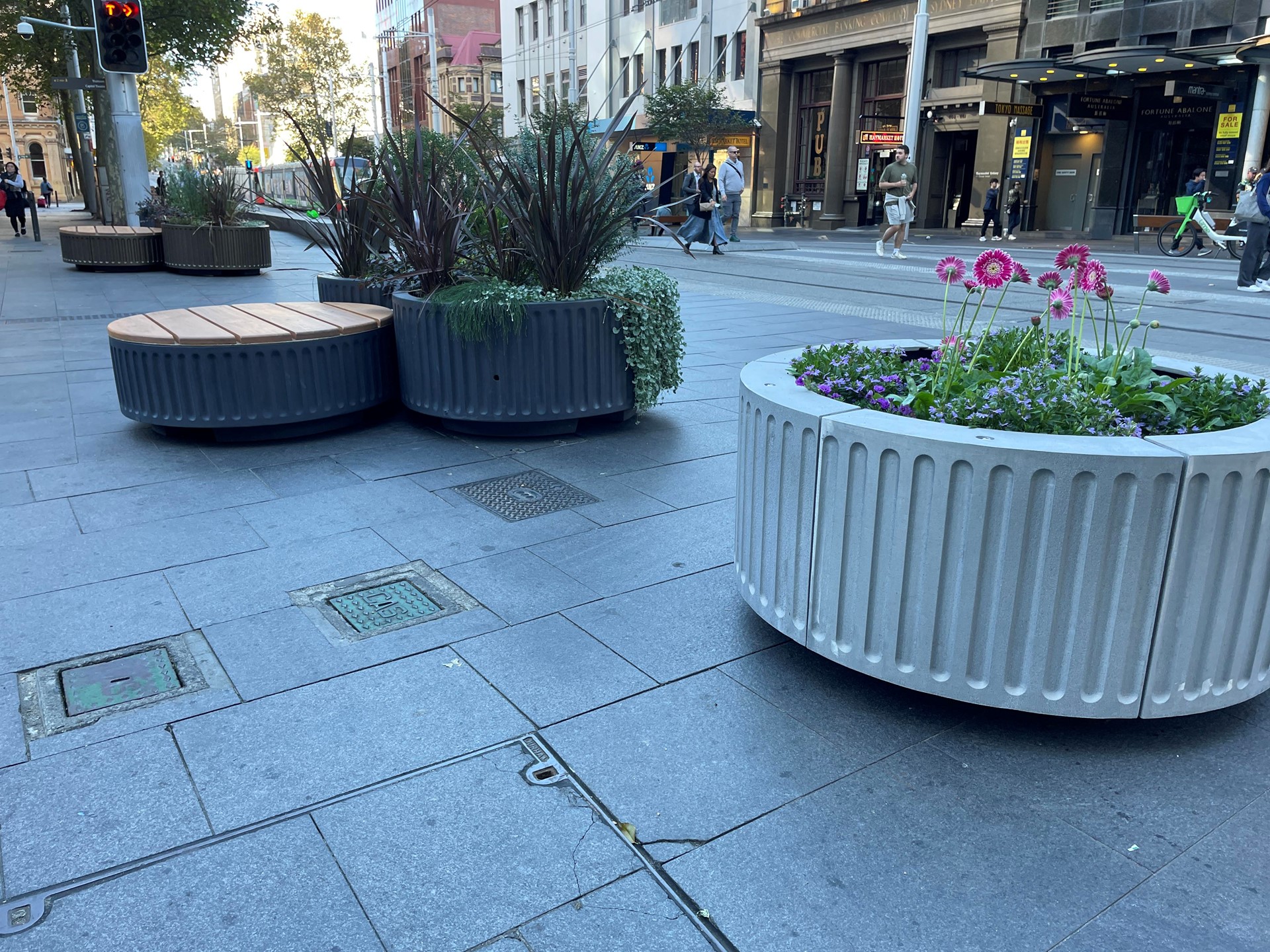 Working with the City of Sydney and architectural firm GPW we developed the new City of Sydney planter range including water reservoirs, a seat as a water storage tank and wicking beds. Testing different finishes and planting techniques the planters are being trialed over 2024 on George St in the city.