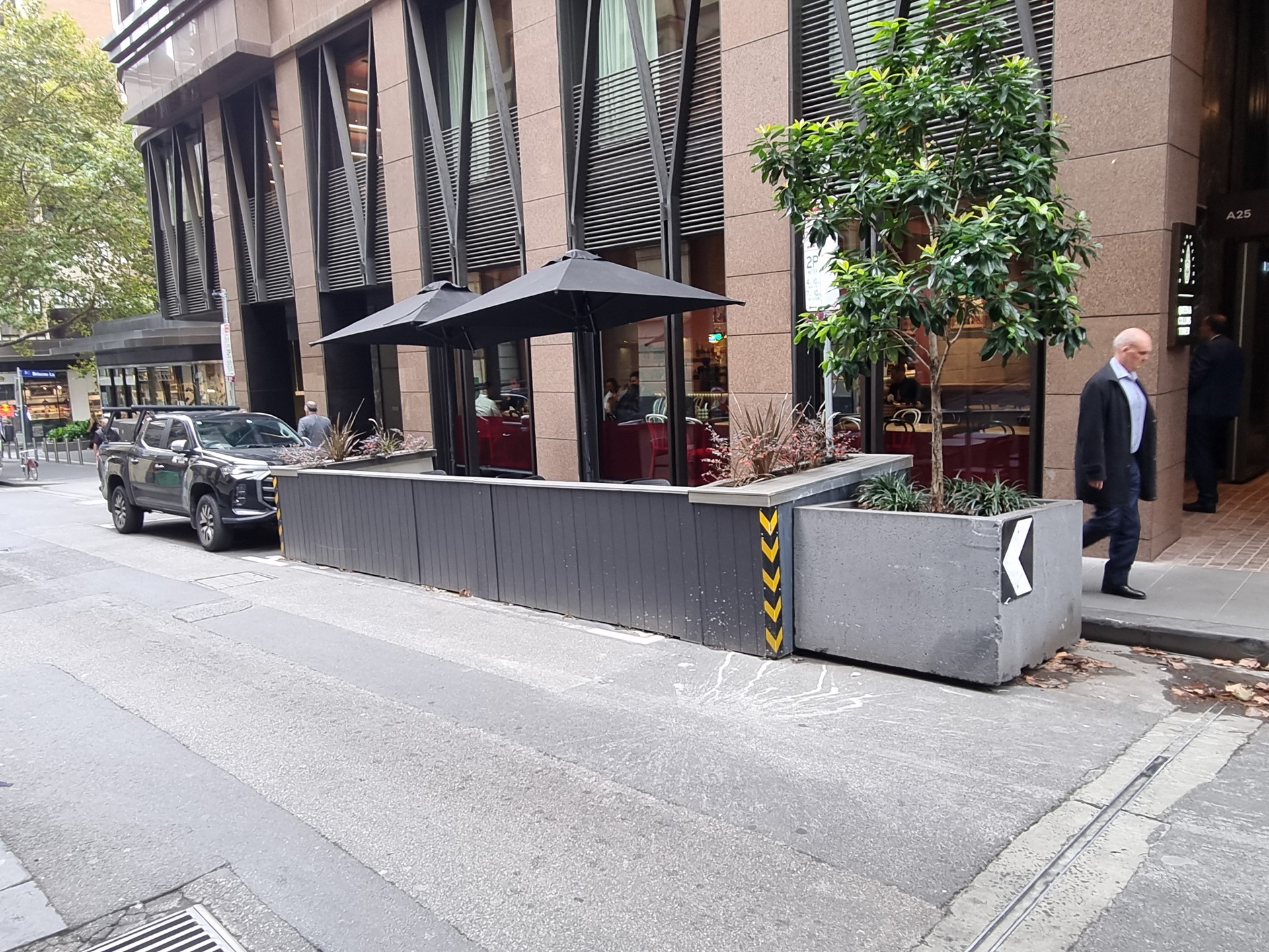 We supplied a modular parklet system using our hinged decking, which allows easy access to the gutter while maintaining a seamless, trip-free transition between the footpath and the parklet. Safety was achieved through the use of concrete barriers fitted with our Saddle Planters, which were then clad to elevate the overall appearance and integrate with the streetscape.