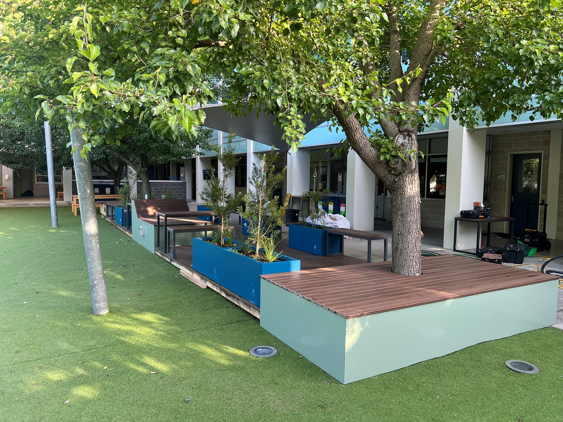 We used FSC sustainable Australian hardwood, LED strip lighting, power outlets, Water fountain and feature plus native plants to design and build this unique space for Blacktown.