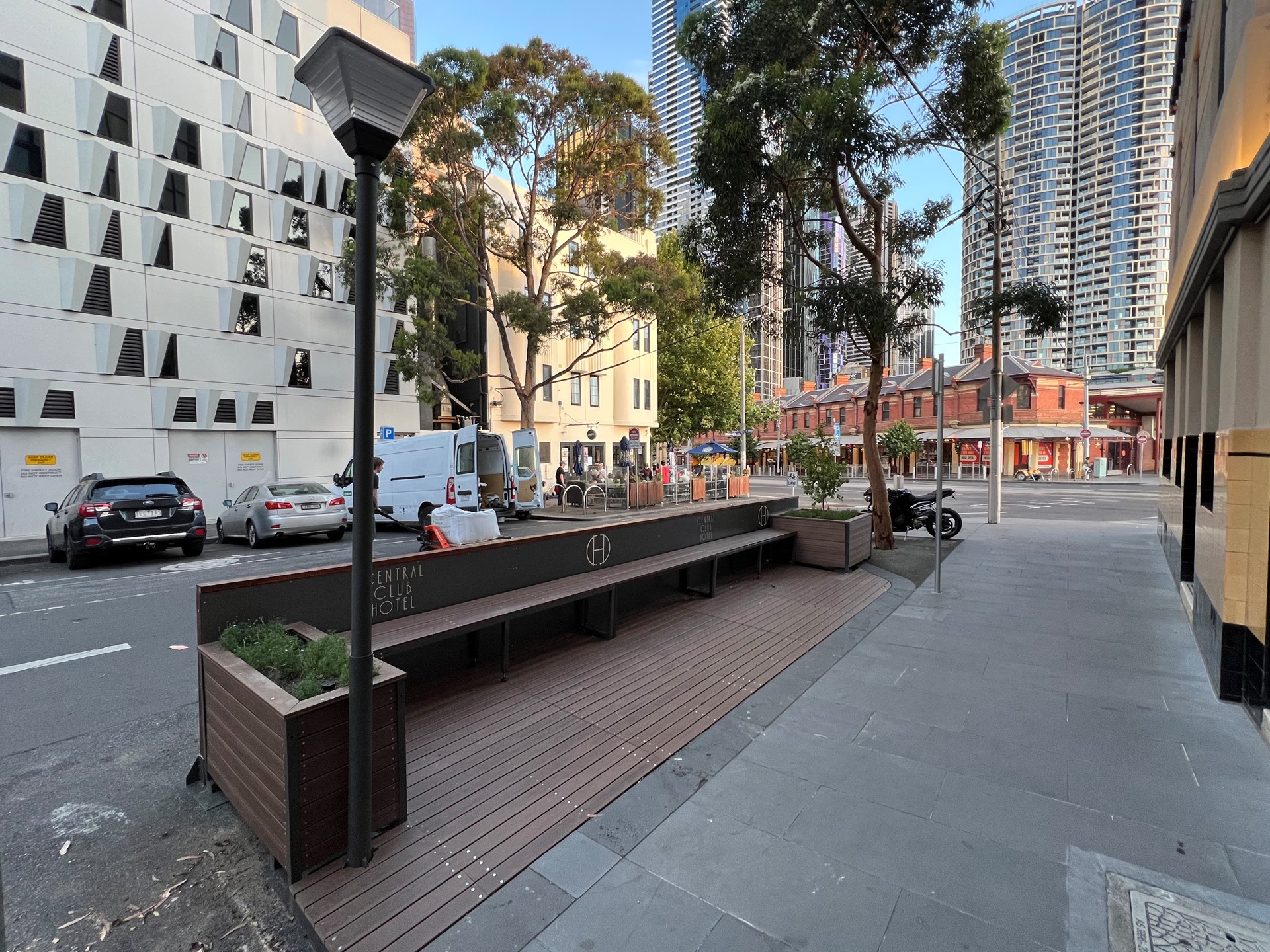 Using our modular hinged decking system, the parklet provides a seamless, no-trip transition between the footpath and deck, while still allowing easy access to the gutter below.