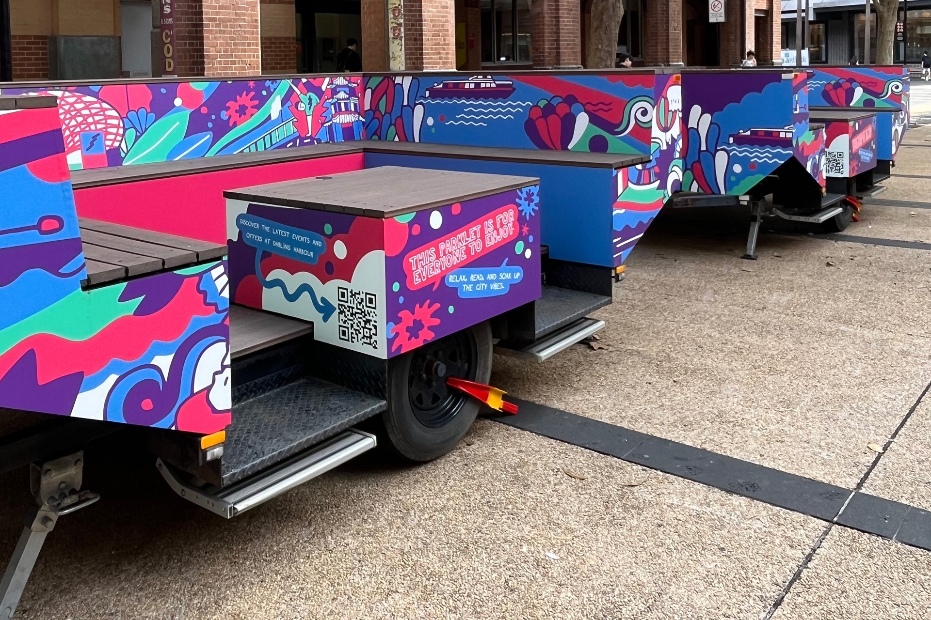 Transport NSW has four of our Mobile Parklets. We upgraded these original parklets, replacing the facading with composite aluminium board that was more durable and easier to apply new vinyl skins when required.