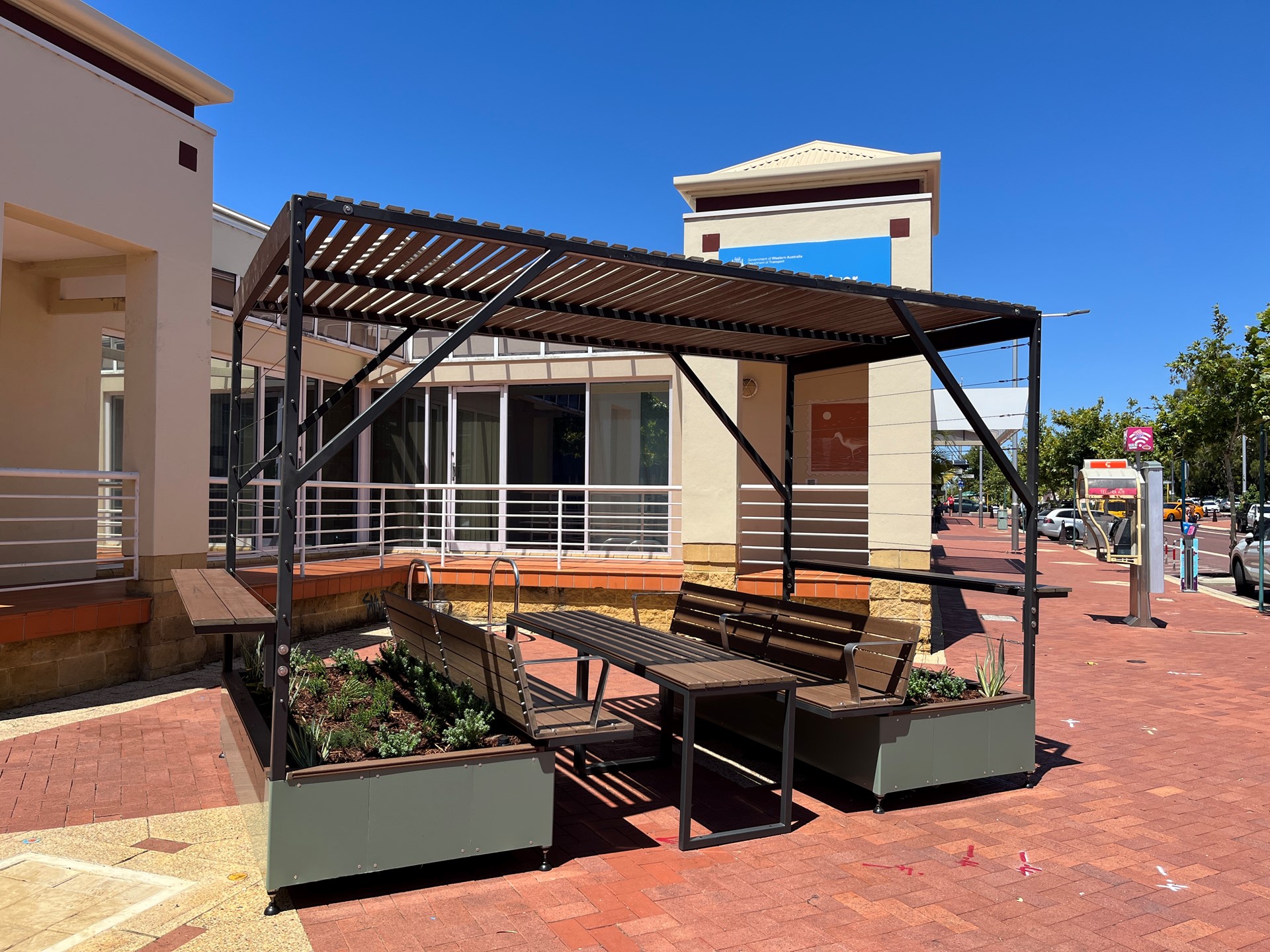 The standard pergola design was adapted to suit the site, with one end bench removed to create additional open space and a permanent table installed at the opposite end to improve functionality and user comfort. The parklet was also upgraded with composite timber cladding internally and externally, aligning the structure with the surrounding architectural character of the precinct.