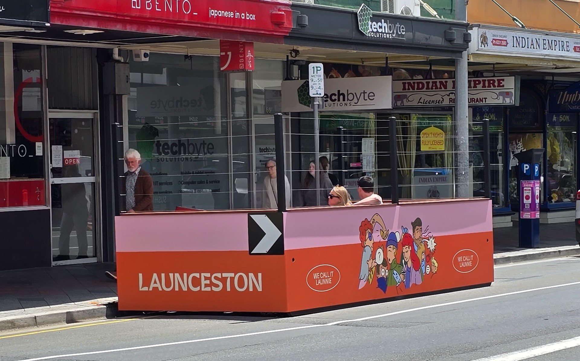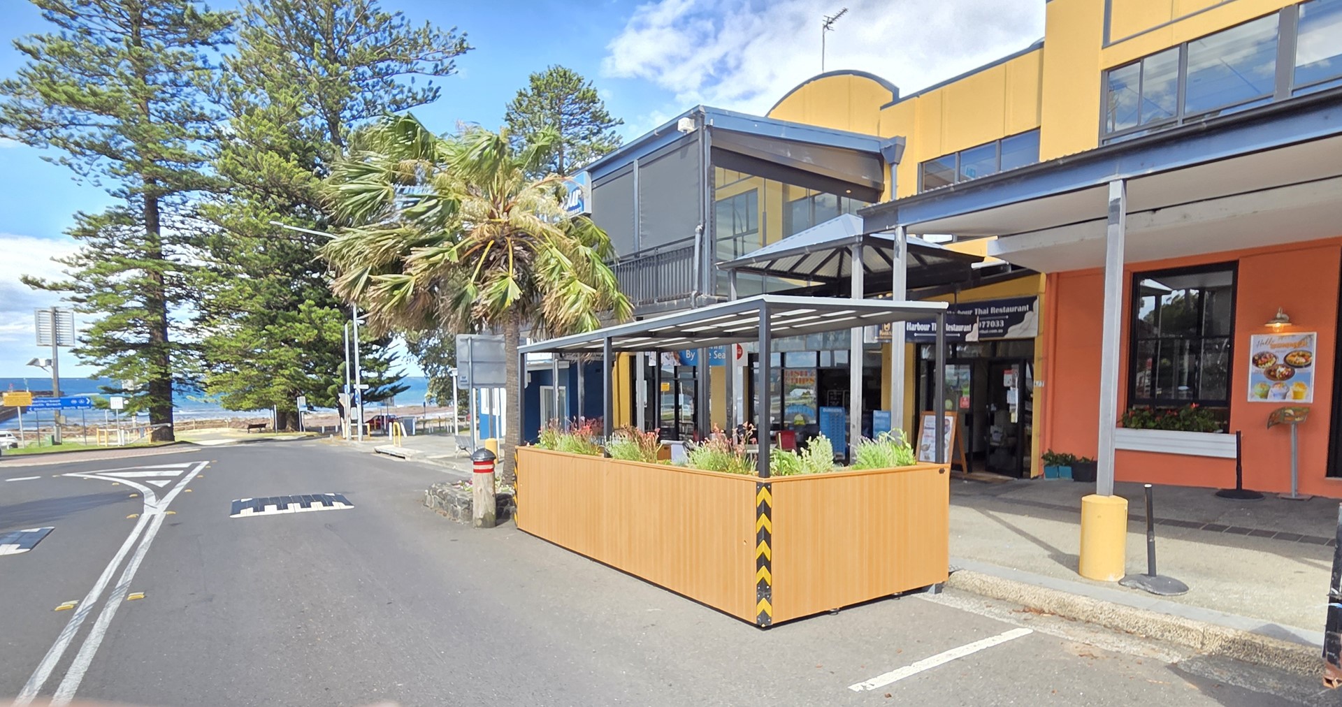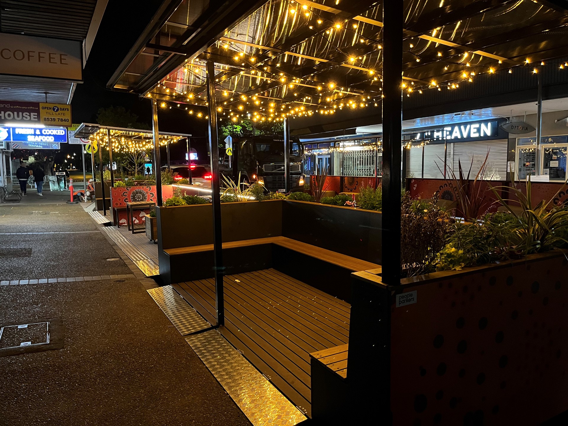 The 9 metres of fixed benches plus placing additional table and chairs gives seating for 10-20 people. Option to combine Patio Parklets together. Umbrellas, solar lanterns or shade cloth support poles can be placed in corners. The metal frame and cladding provide separation from traffic.