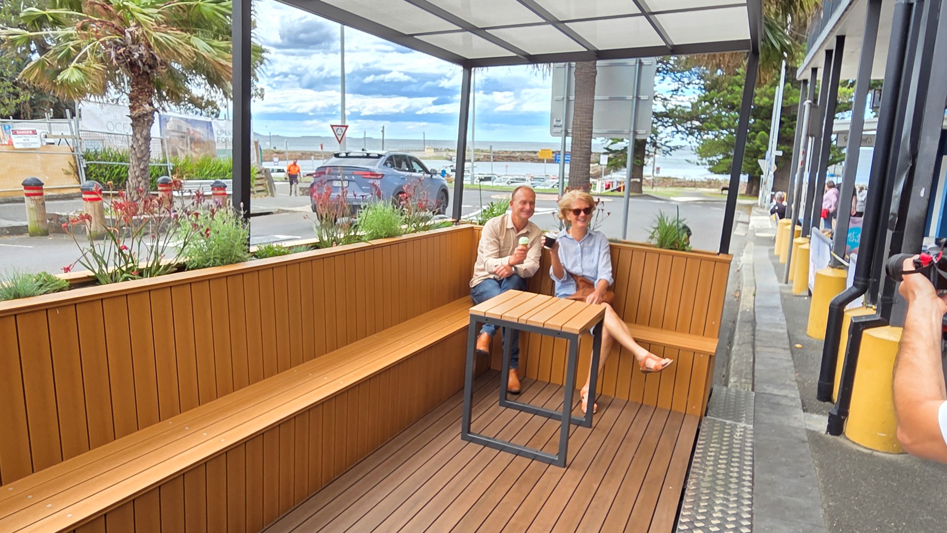 The 9 metres of fixed benches plus placing additional table and chairs gives seating for 10-20 people. Option of timber slats or polycarbonate roof to provides shade, cooling and rain protection. Solar lighting is optional. The metal frame and cladding separates traffic from the public.