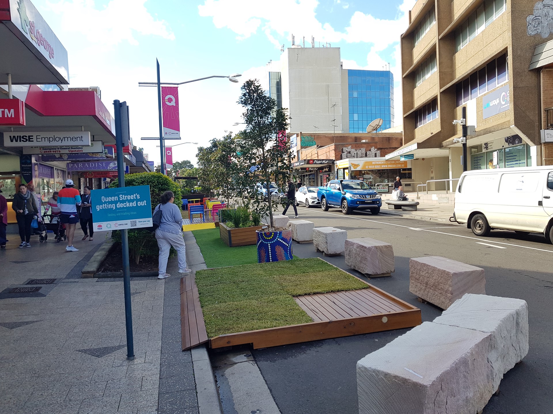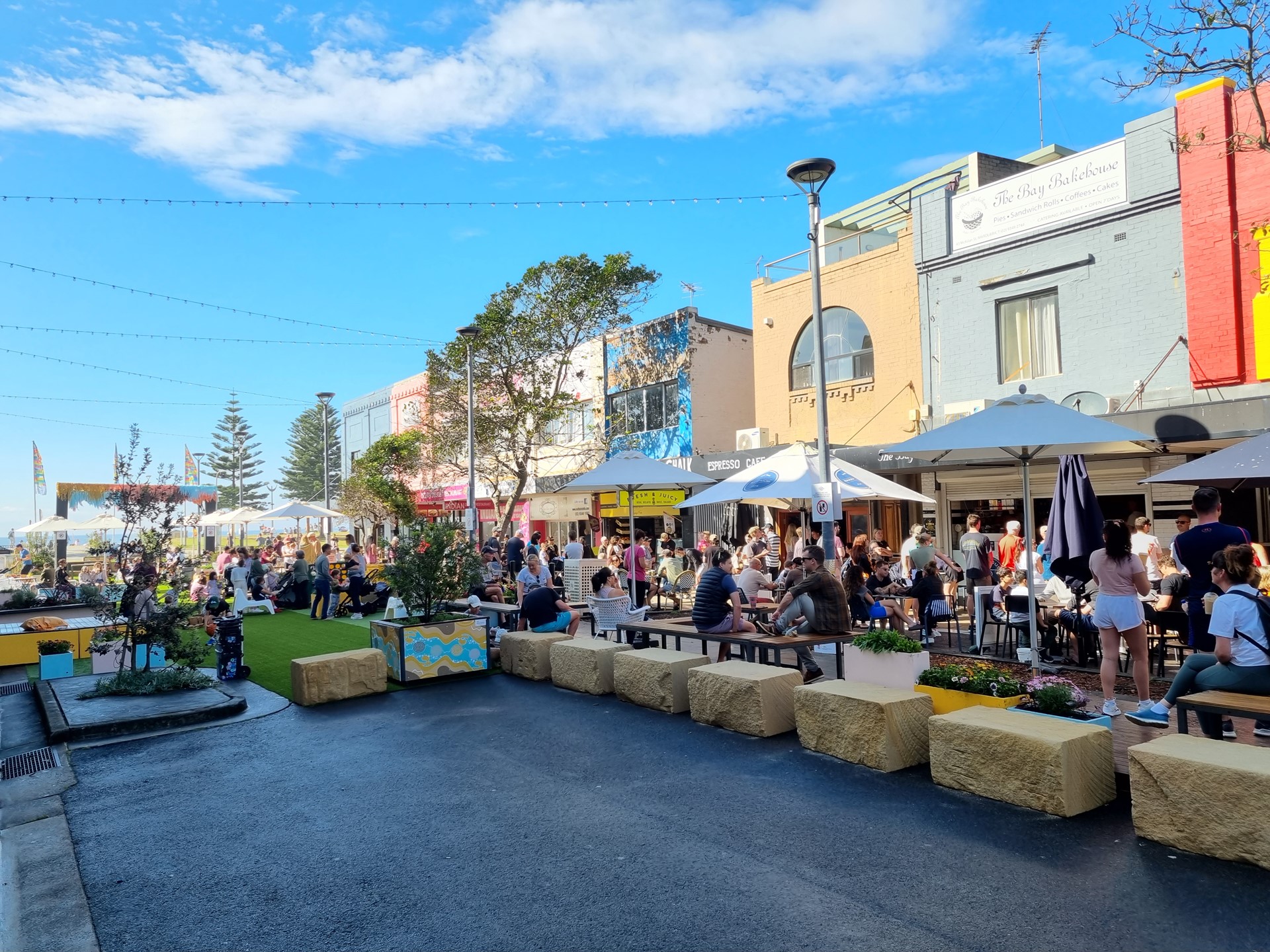 Using planters and/or sandstone logs as barriers offers a practical and low-cost solution for defining and protecting outdoor spaces. These elements serve dual purposes—providing both physical separation from traffic or hazards and enhancing the visual appeal of a site with natural materials and greenery. Ideal for temporary or semi-permanent installations, they are especially suited to councils or organisations working with tight budgets who still want to prioritise patron safety and comfort. This approach also supports urban greening goals, softening hardscapes and creating more inviting, human-scaled environments.