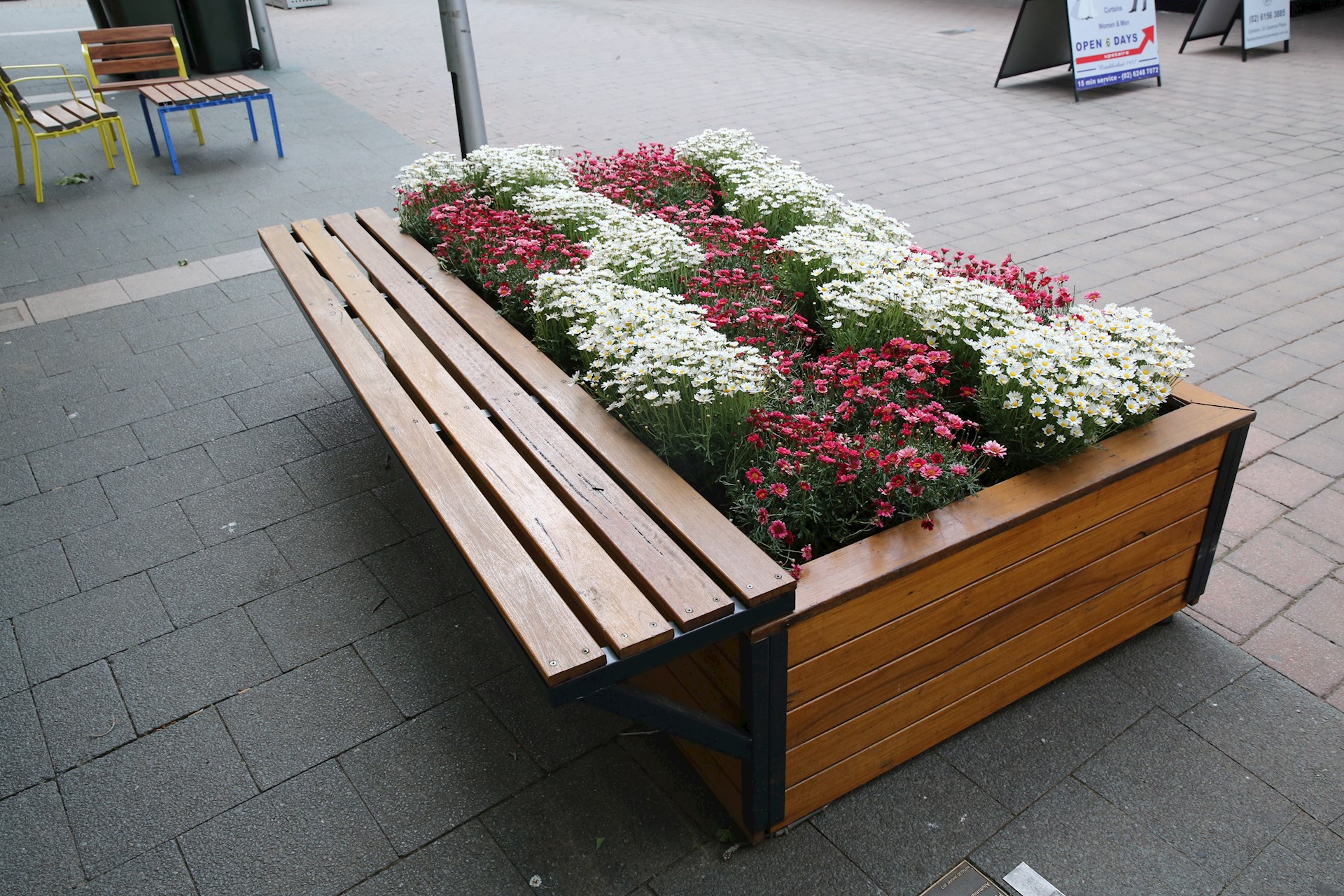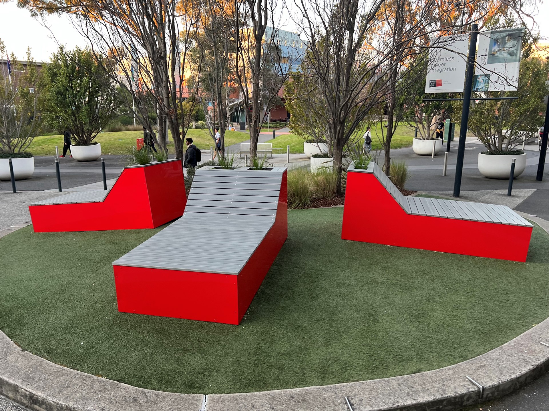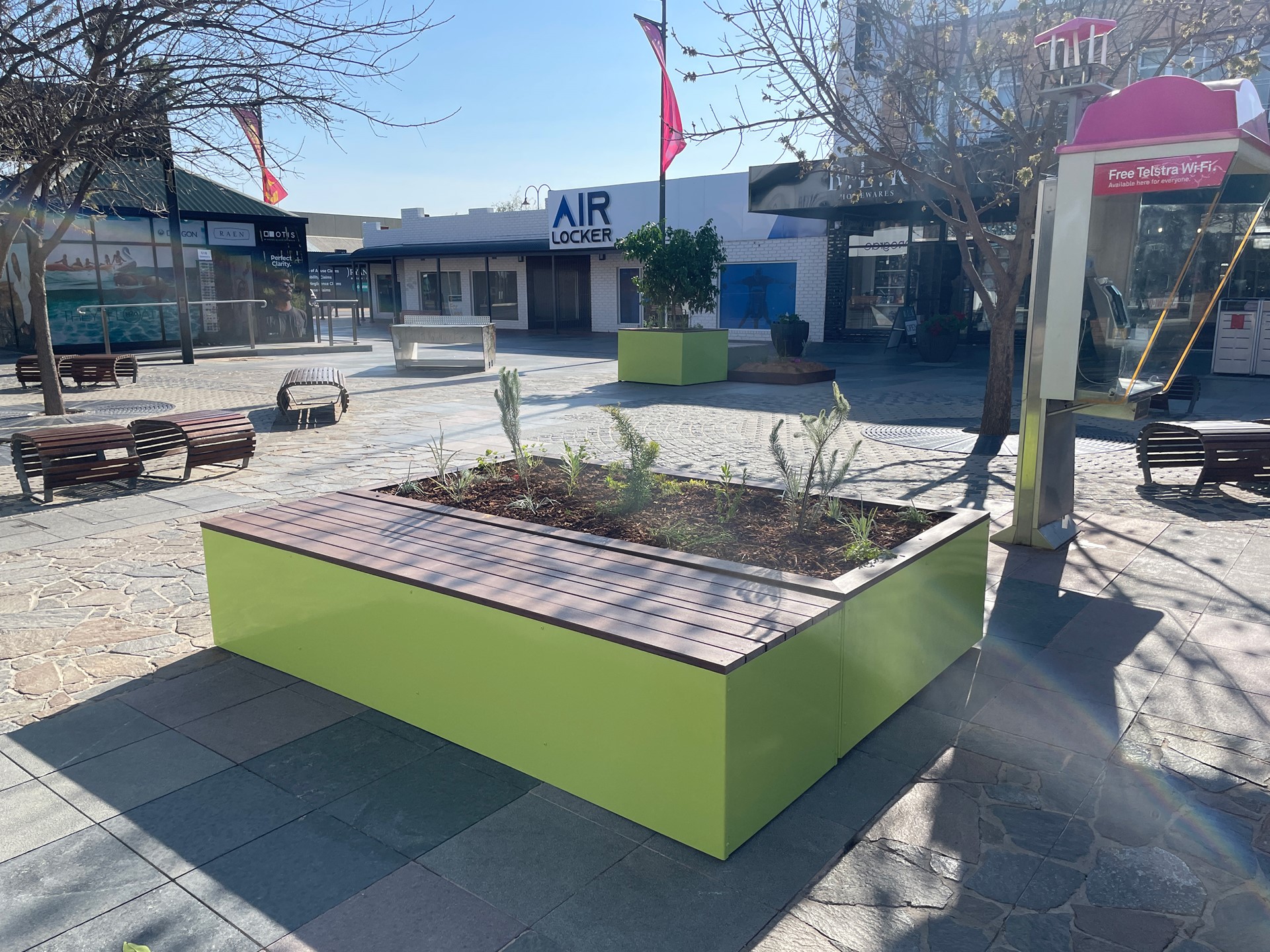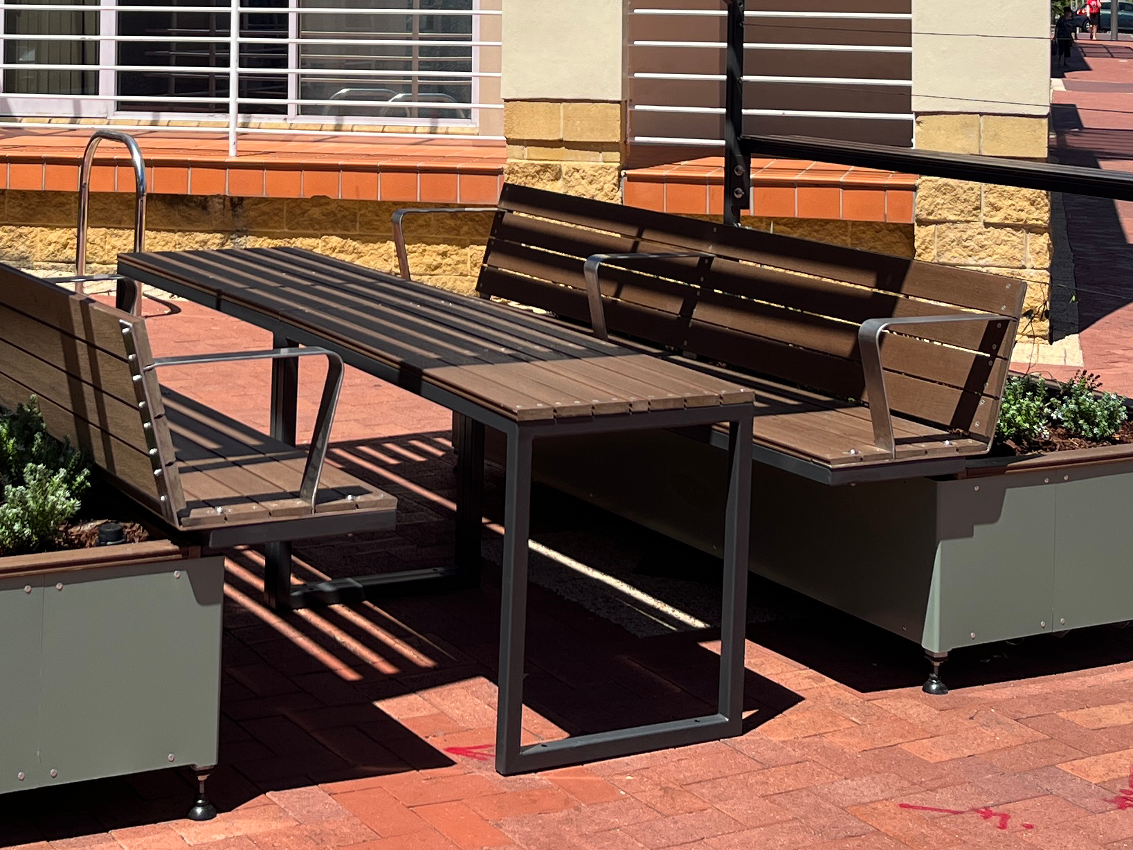 Our seating and tables are free standing. Made for commercial applications they are sturdy, well designed and durable. Australian Hardwood timber or modwood surfaces with powder coated steel frames. The benches and tables also have fixing points to other bench units and to the ground to prevent theft.