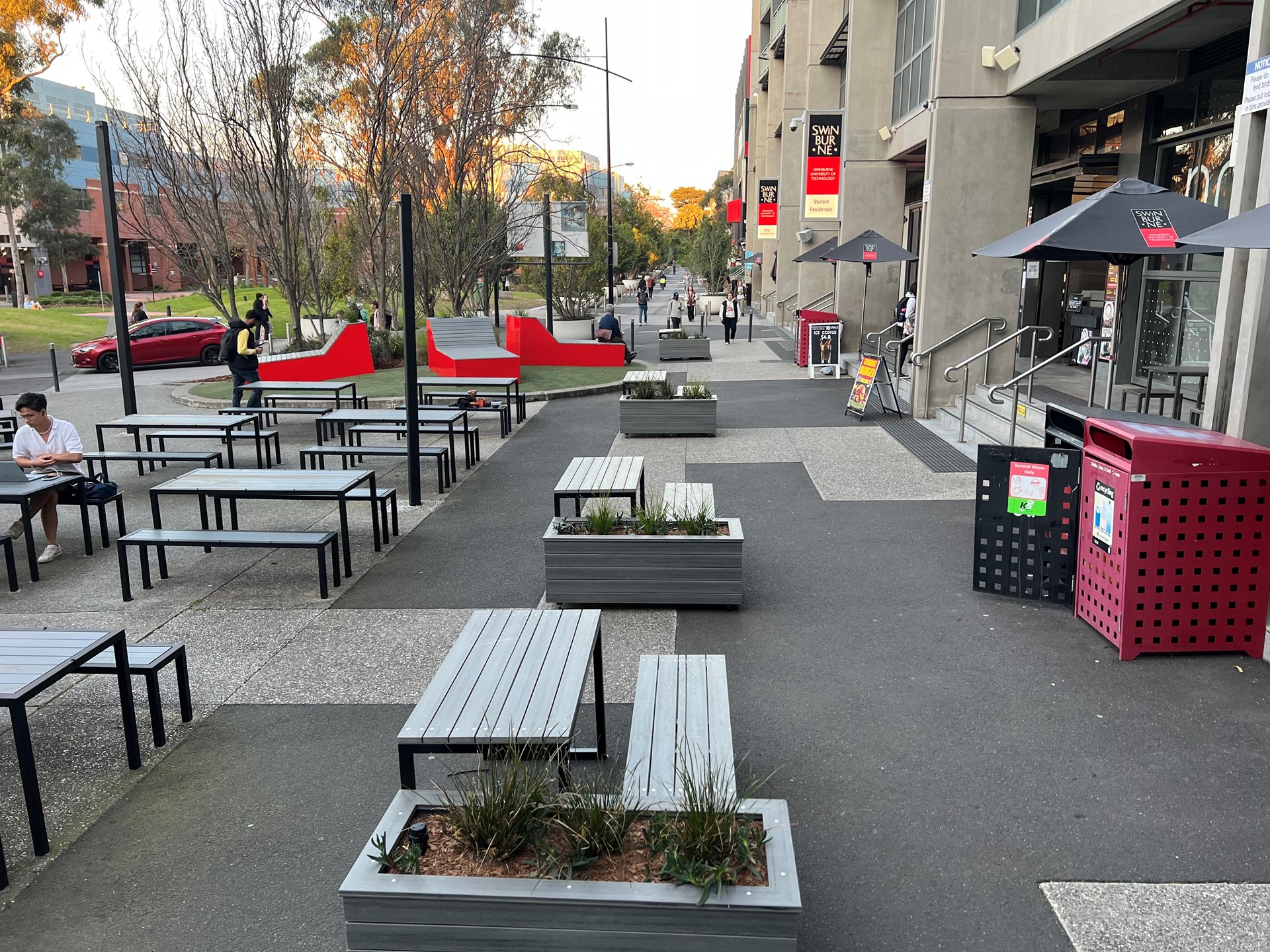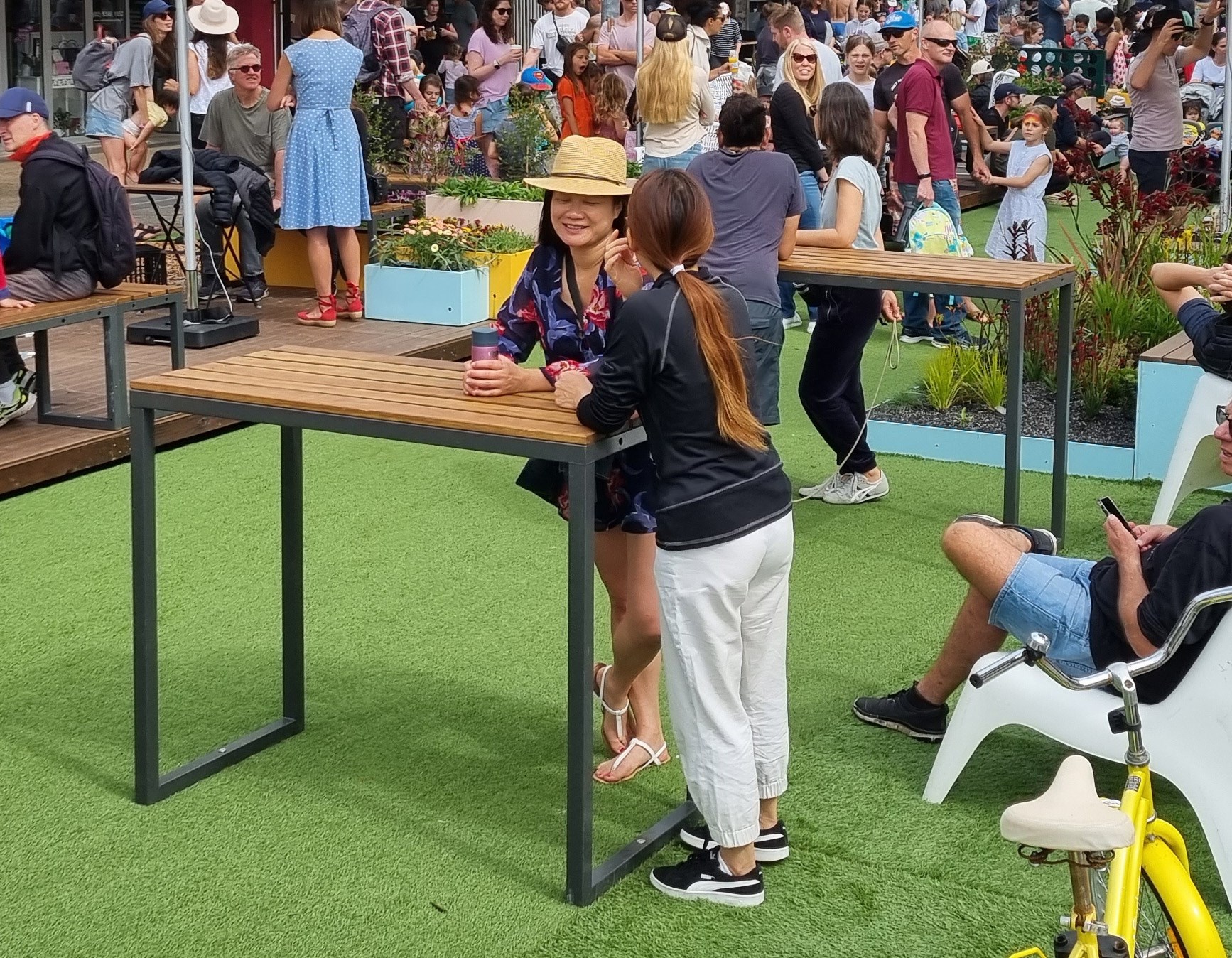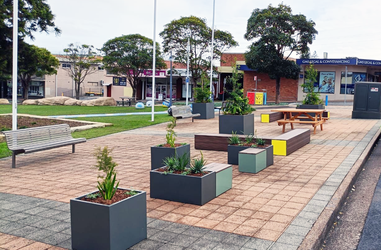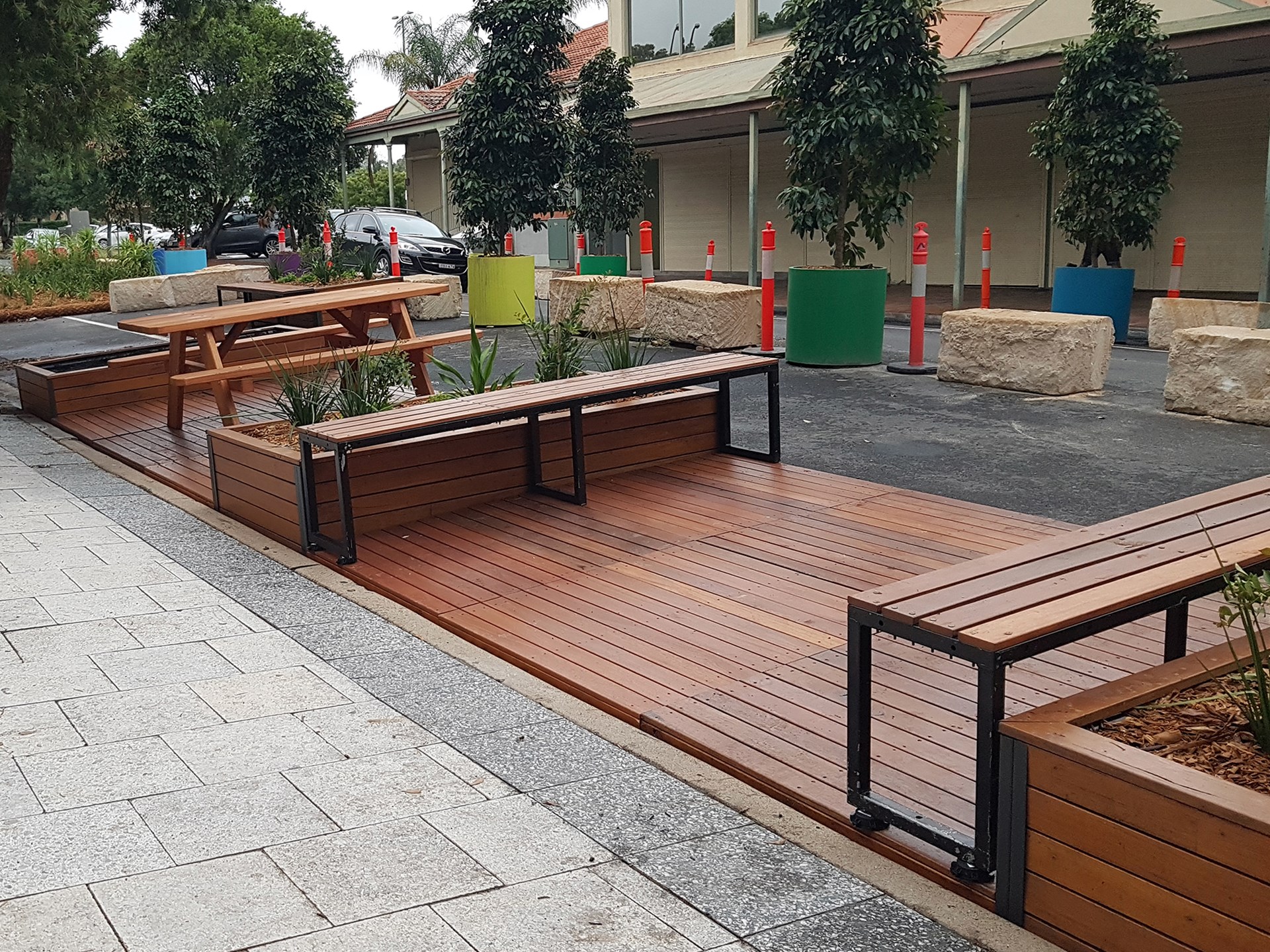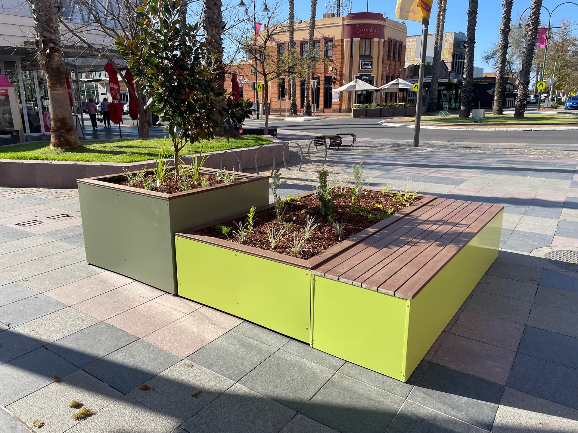 Our seating and tables are free standing. Made for commercial applications they are sturdy, well designed and durable. Australian Hardwood timber or modwood surfaces with powder coated steel frames. The benches and tables also have fixing points to other bench units and to the ground to prevent theft.